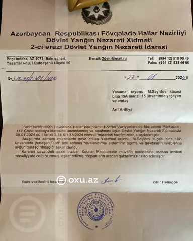 "Sizin tərəfinizdən Fövqəladə Hallar Nazirliyinin Böhran Vəziyyətlərində İdarəetmə Mərkəzinin 112 zəng mərkəzinə ünvanlanmış və baxılması üçün Dövlət Yanğın Nəzarəti Xidmətində 08.01.2024-cü il tarixli 3-18-5/1-58/2024 nömrəli müraciəti tərəfimizdən araşdırılıb. Araşdırma zamanı müraciətdə qeyd edilən Yasamal rayonu, M.Seyidov küçəsi bina 19A ünvanında yerləşən "Loft" adlı kafenin havalandırma sisteminin norma və qaydaların tələblərinə uyğun quraşdırılmadığı aşkar olunub. Kafenin cavabdeh şəxsi İnzibati Xətalar Məcəlləsinin müvafiq maddəsinə əsasən inzibati məsuliyyətə cəlb olunub, aşkar edilmiş nöqsanların aradan qaldırılması tələb edilib", - deyə sənəddə qeyd olunub.