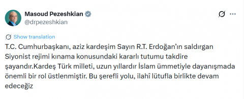 "Əziz qardaşım Rəcəb Tayyib Ərdoğanın təcavüzkar sionist rejimi qınamaq məsələsində qətiyyətli mövqeyi təqdirəlayiqdir. Qardaş türk milləti uzun illərdir İslam ümməti ilə həmrəylikdə mühüm rol oynayıb. Bu yolu davam etdirəcəyik", - o bildirib.