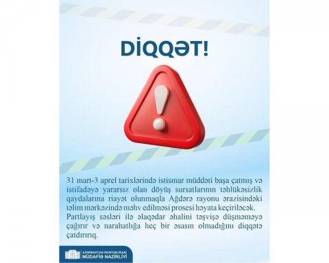 31 mart - 3 aprel tarixlərində istismar müddəti başa çatmış və istifadəyə yararsız olan döyüş sursatlarının təhlükəsizlik qaydalarına riayət olunmaqla Ağdərə rayonu ərazisindəki təlim mərkəzində məhv edilməsi prosesi həyata keçiriləcək.