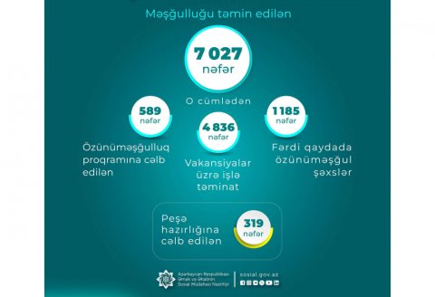 Nazirliyin İctimaiyyətlə əlaqələr şöbəsindən bildirilib ki, həmin sakinlərdən artıq 7 min 27 şəxsin məşğulluğu təmin edilib. O cümlədən 4 min 836 nəfərin vakansiya üzrə işlə təminatı həyata keçirilib, 589 nəfər özünüməşğulluq proqramına cəlb edilərək bu proqram çərçivəsində öz kiçik ailə təsərrüfatlarını yaradıb. 1185 nəfər isə fərdi qaydada özünüməşğul şəxslərdir.